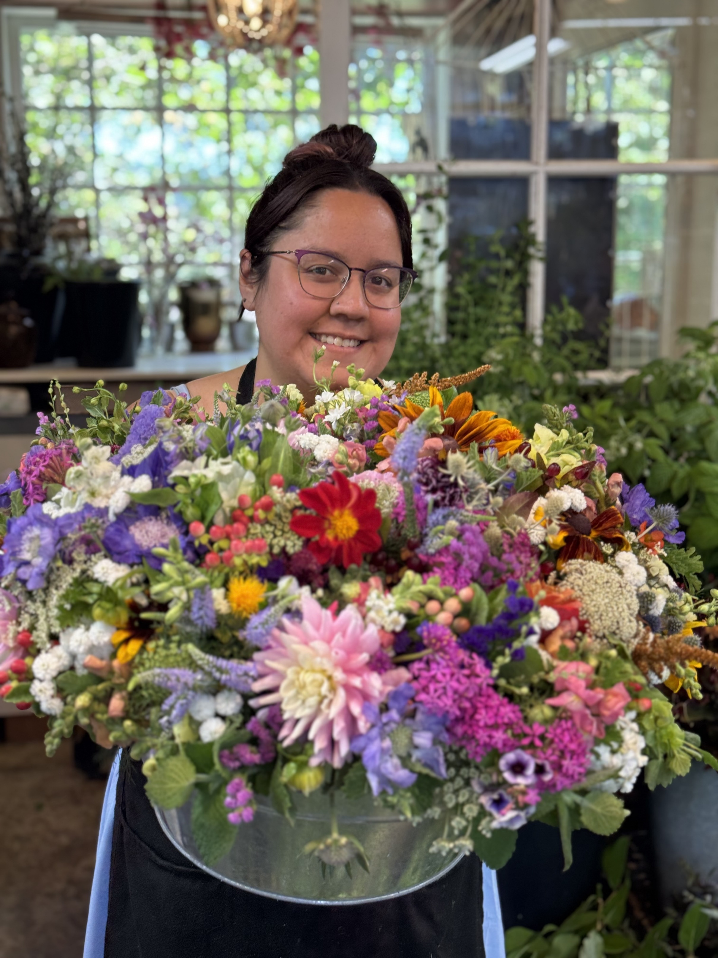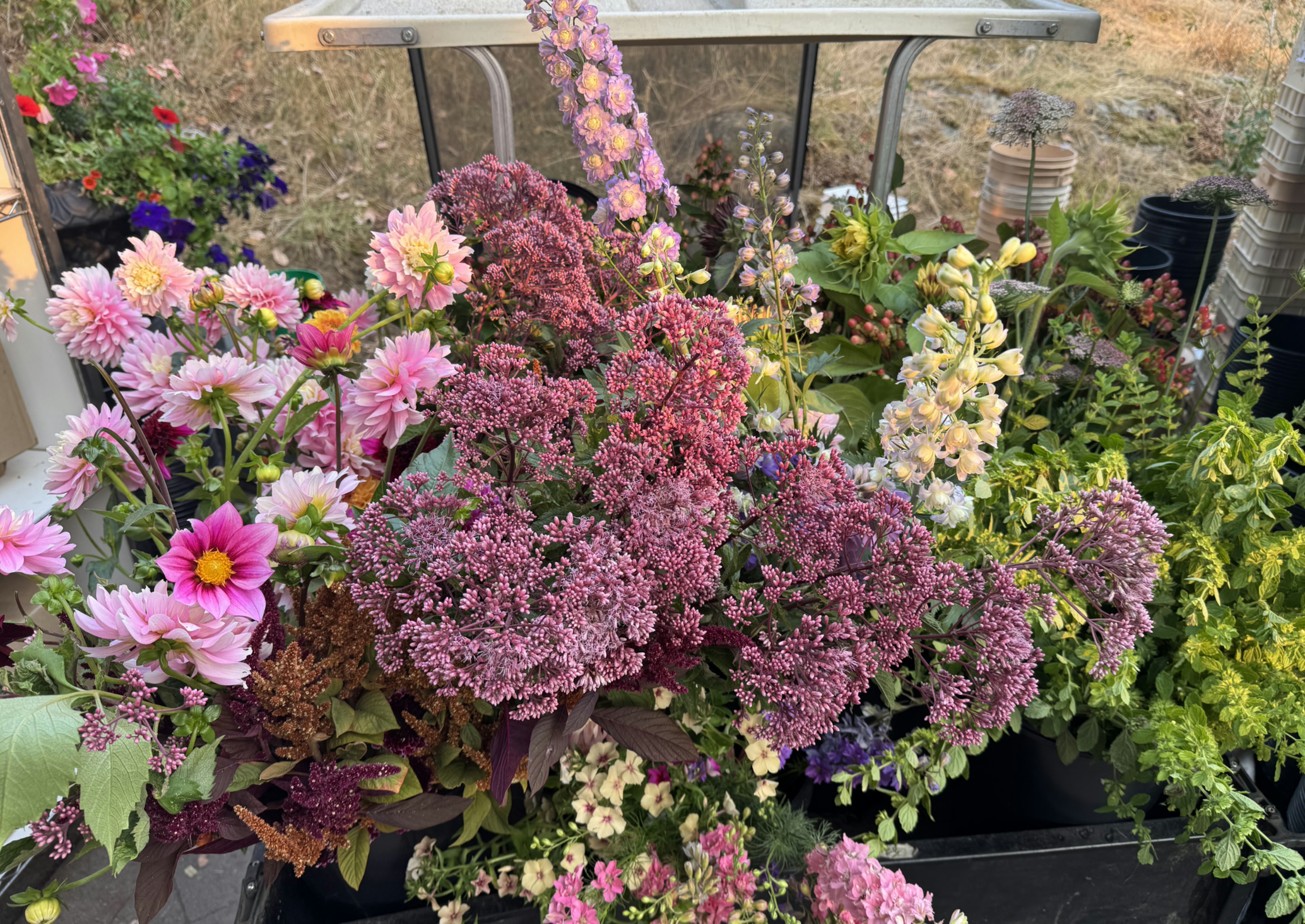 If you come up the driveway you will meet our team in the Flower Studio - Rekha, Megan, Liesbeth and Delaney along with Rachel & Nadiia. Everyone is working together to get the flowers and greens we harvest every morning and evening prepped, displayed and then arranged and wrapped for pick up and delivery or for the flower stand.