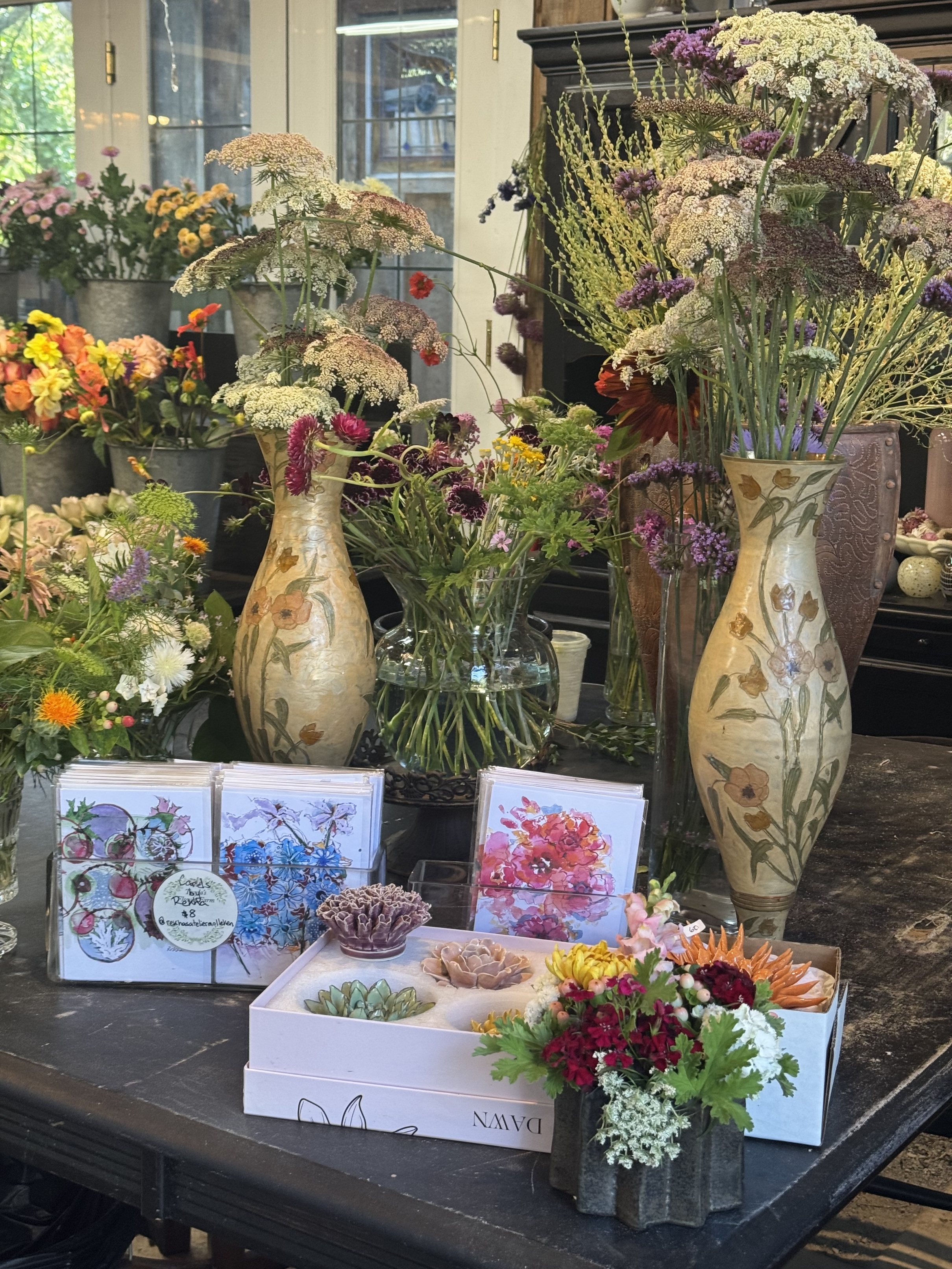 It's August on the flower farm and our 6th season and things have been going quite smoothly! The weather has been great. Our Field Crew is more experienced and we are following proven protocols for growing while always trying a few new things each season. The Flower Studio Team continues to create the most beautiful bouquets and arrangements for the farmstand, local deliveries, subscriptions and special events. Our dried flower studio has had a an upgrade as we collect and dry a wider variety of our blooms and botanicals each year.