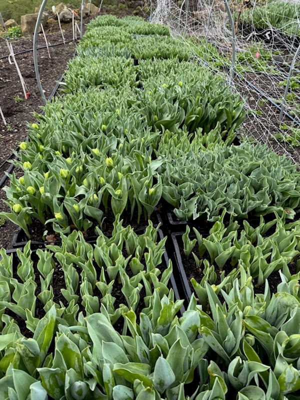 The ranunculus that sprouted in the fall are now budded and if we have a few more warm days then hopefully we will be harvesting blooms in a week or so. Anemones grown in the field continue to be harvested daily.