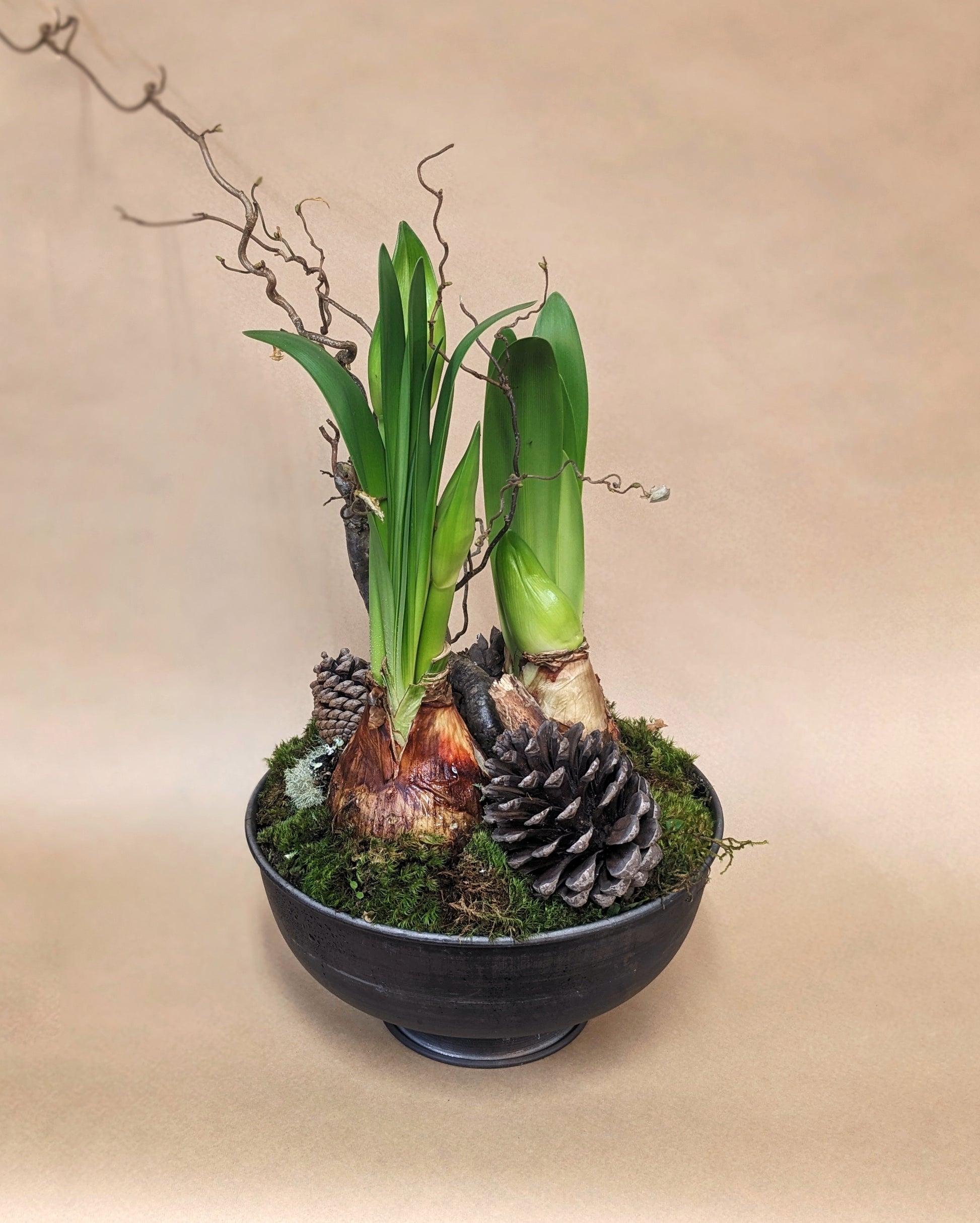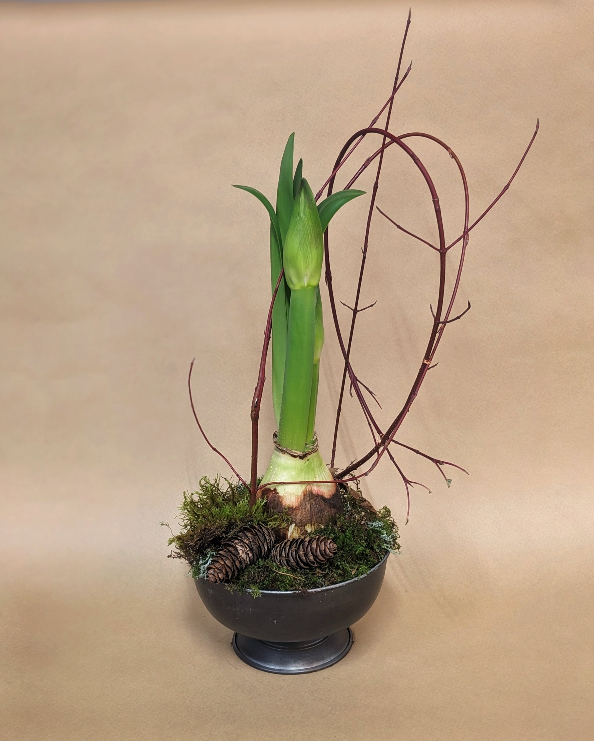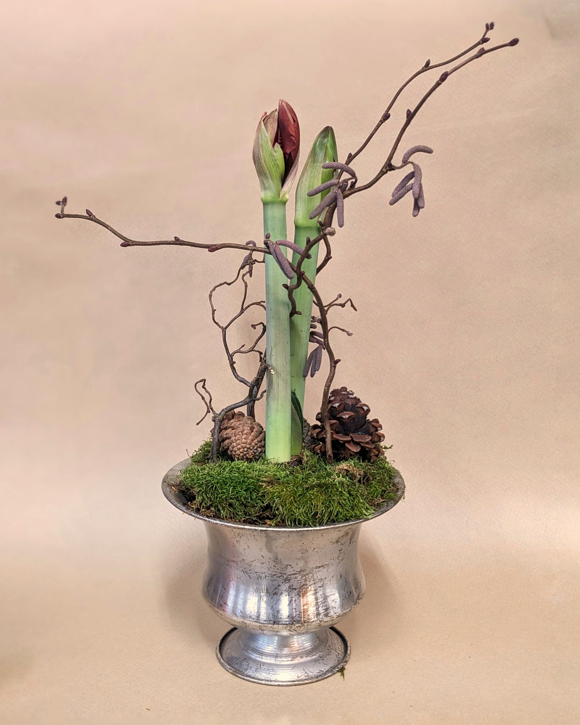 A Red Lion Amaryllis bulb in a metal or ceramic planter, decorated for the winter season with dogwood, corkscrew hazel, moss, and pinecones. Makes a great gift or seasonal decoration as Amaryllis are very low maintenance!