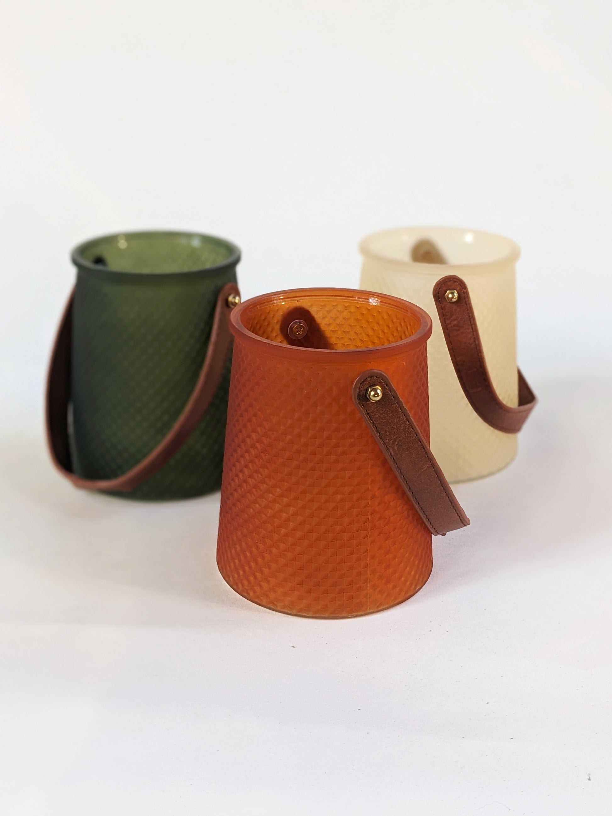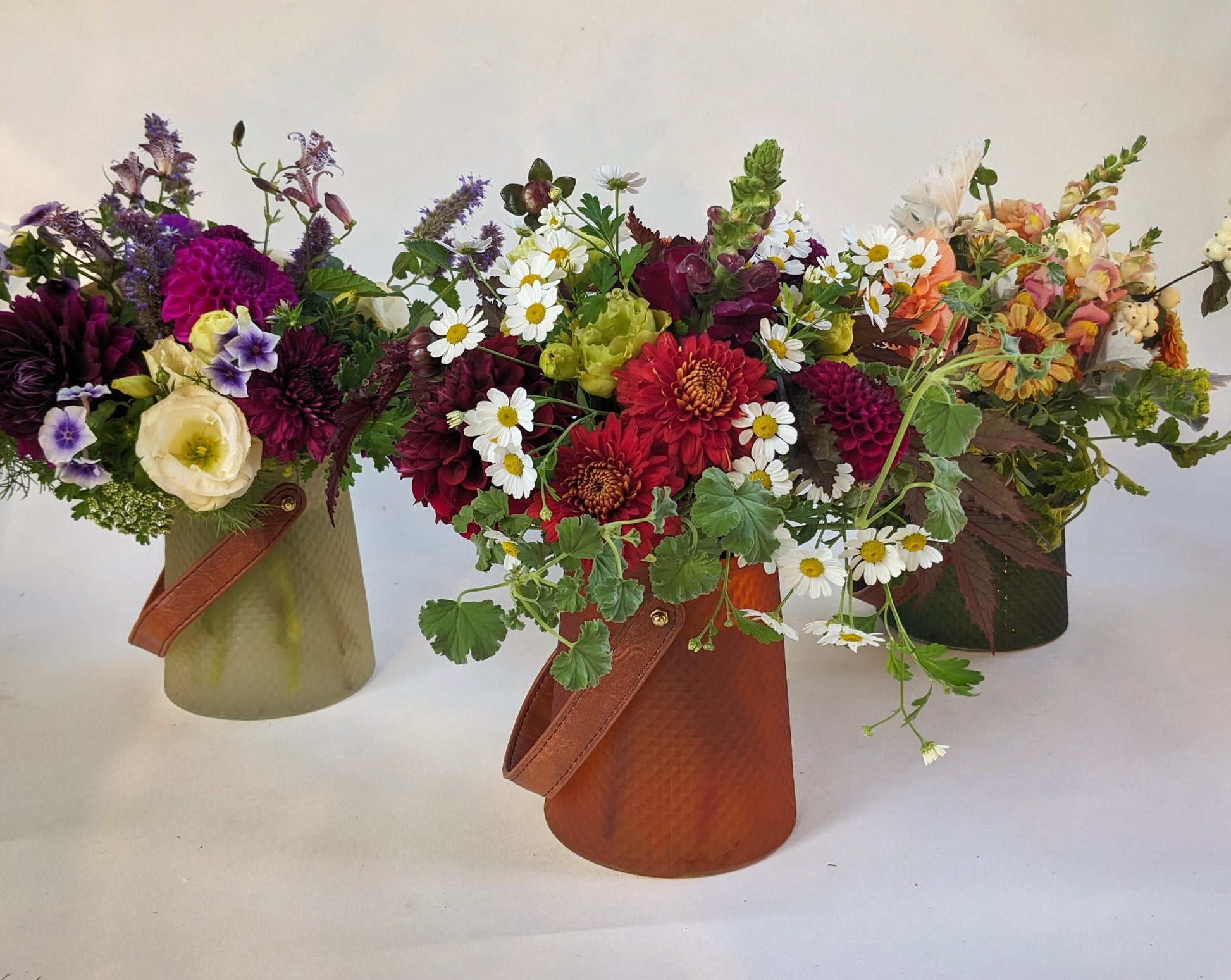 A fresh arrangement made to order in an elegant glass basket style vase. Order a single colour or as a set of three for your festive fall events!