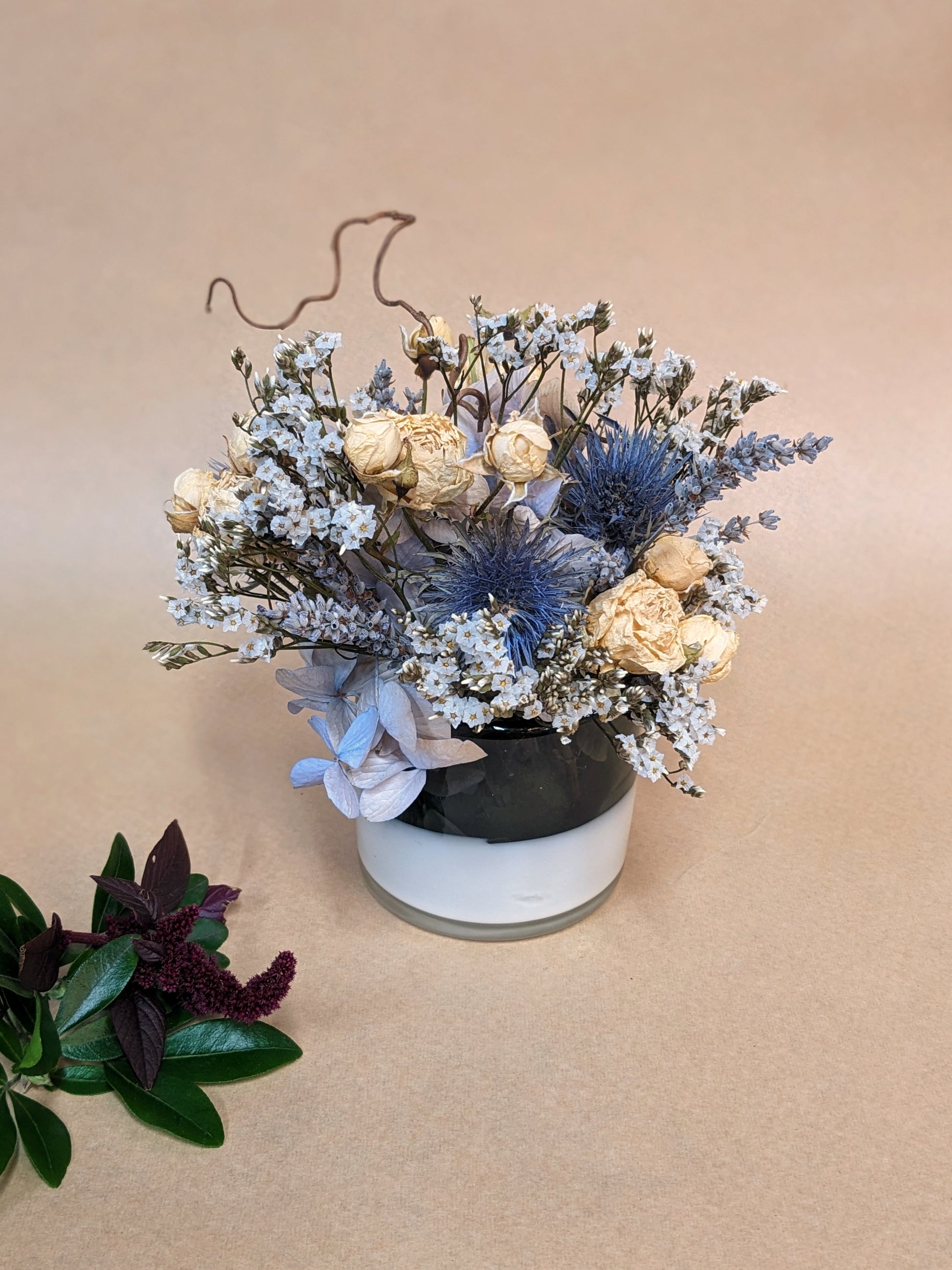 A made-to-order dried arrangement in your choice of blown glass votive. A great everlasting gift! Approximately 8" height. If you have any specific colours or special requests be sure to let us know in thr Note section!