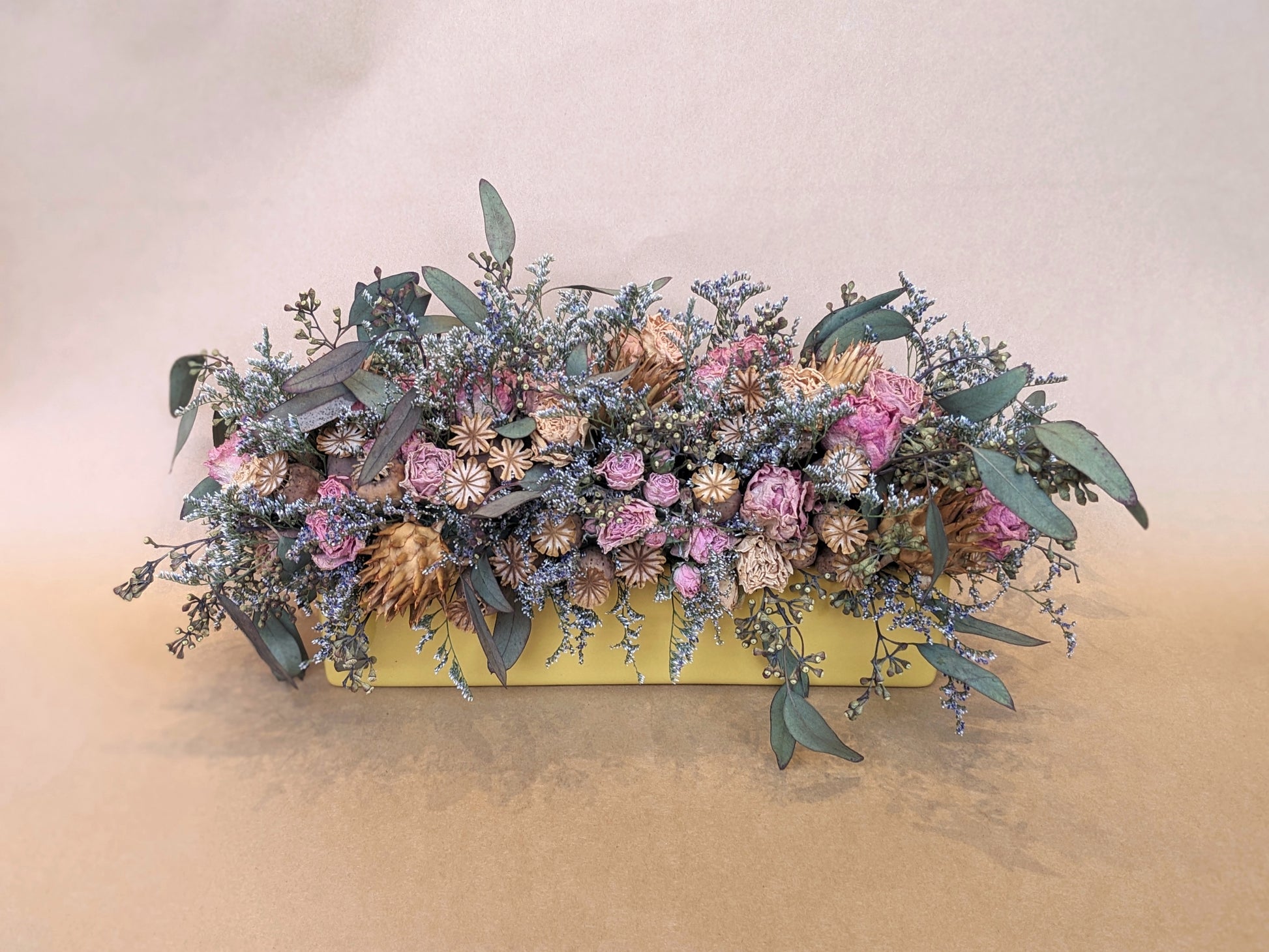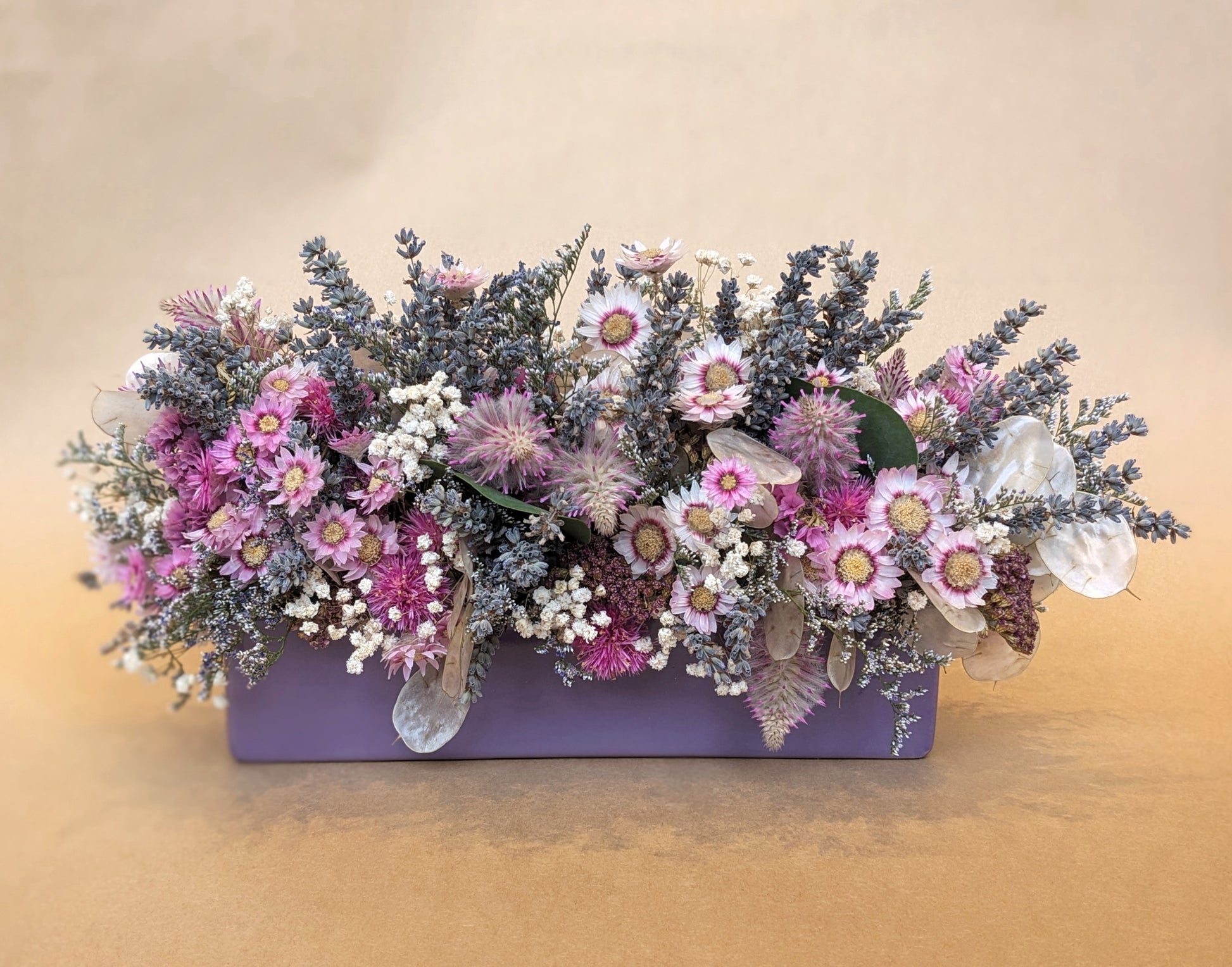 An everlasting dried arrangement in a rectangular ceramic planter. Can be used as a low centerpiece, or can be affixed to a wall using the keyholes on the back!